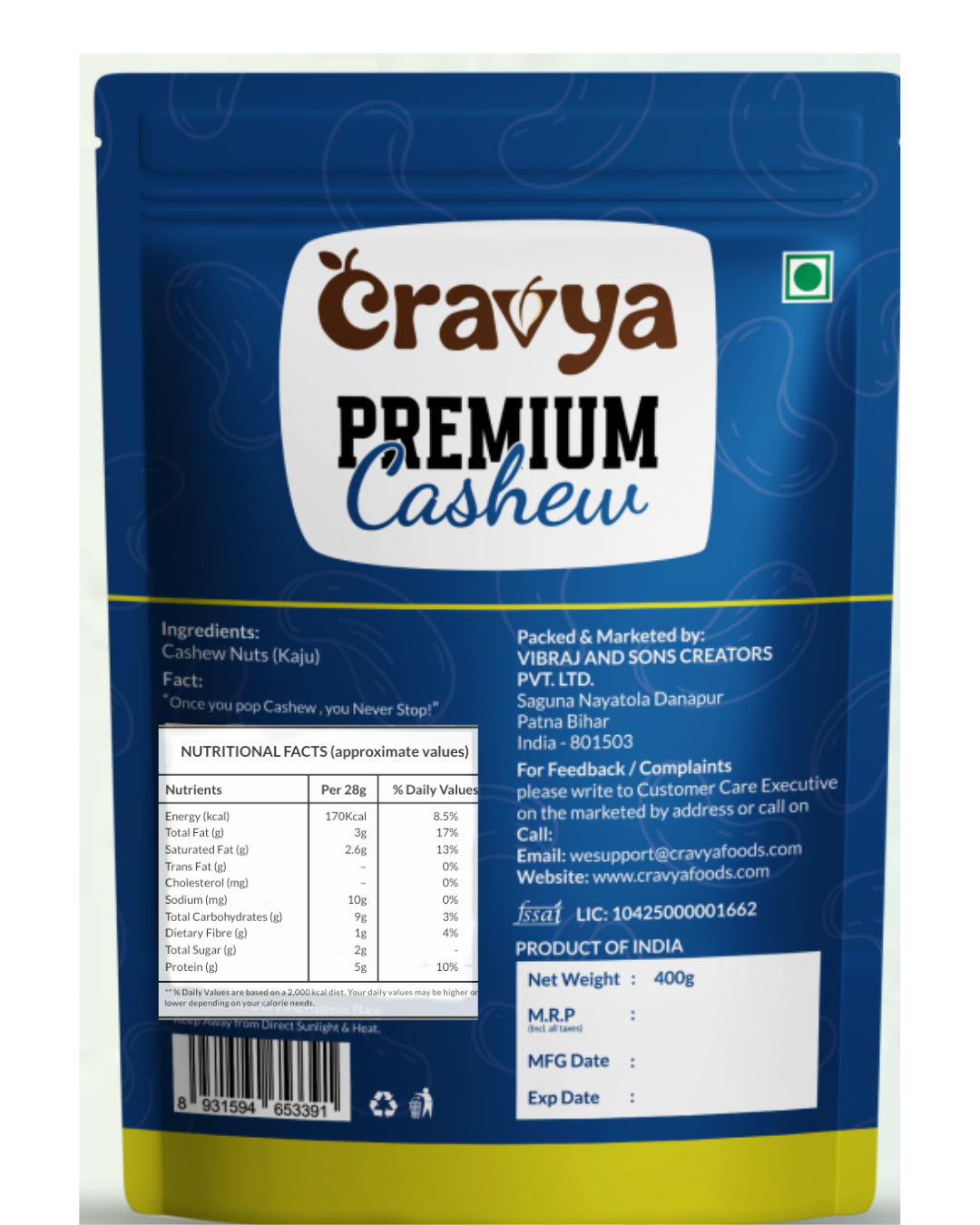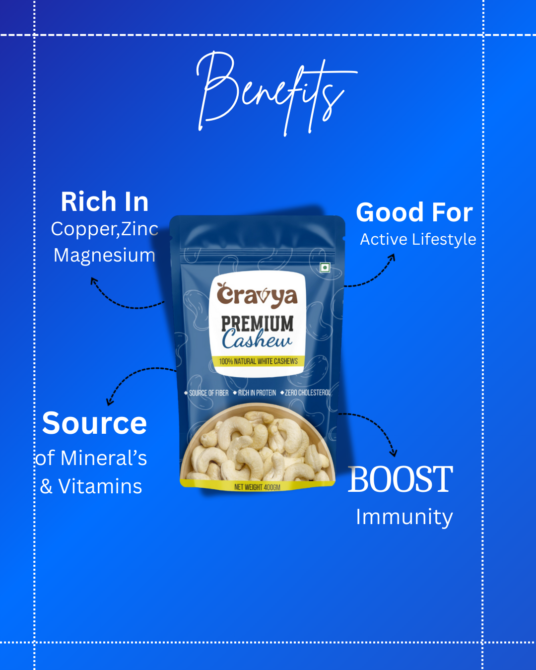 Cravya Premium Cashews – Handpicked, whole, and delightfully crunchy.